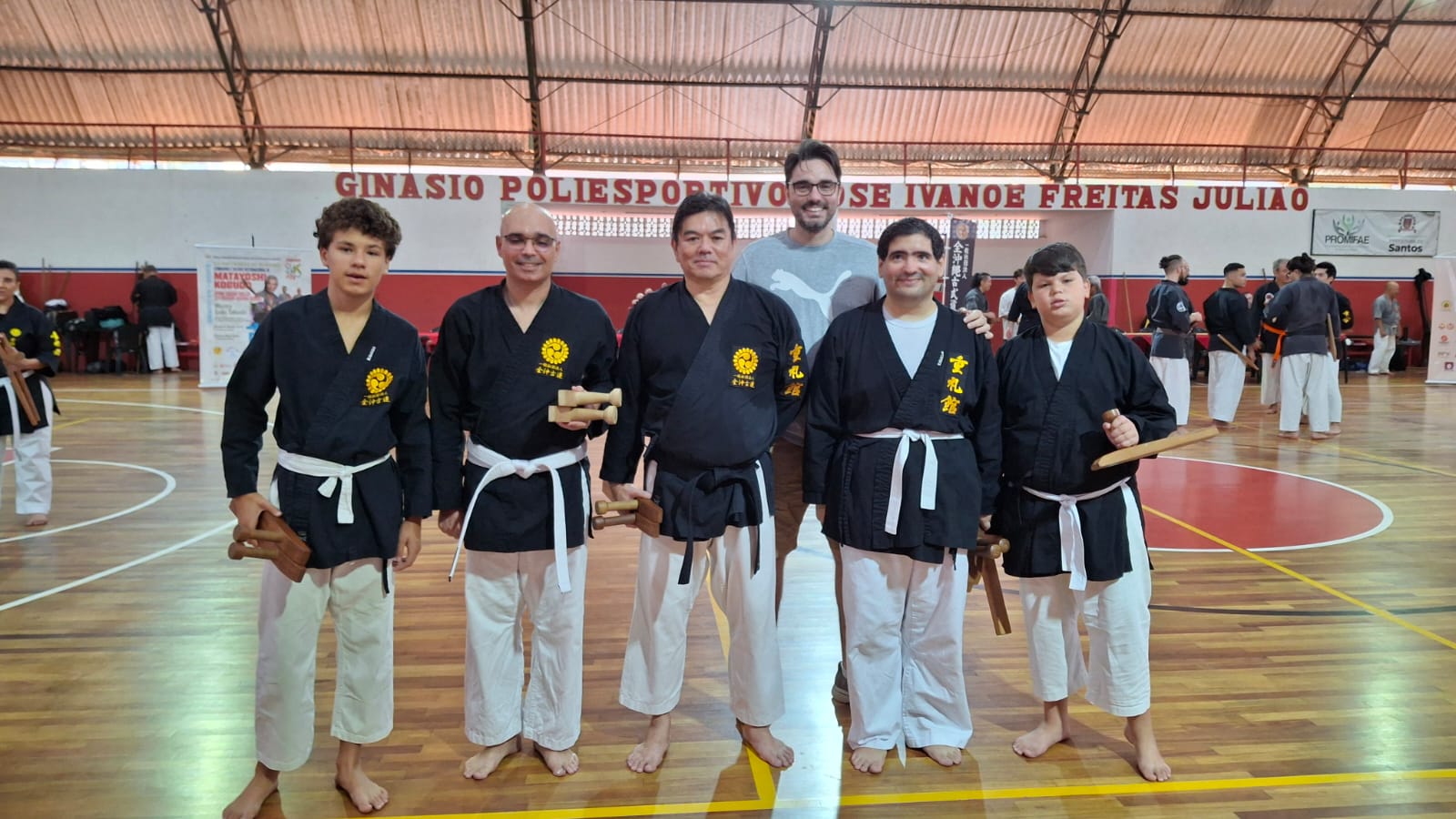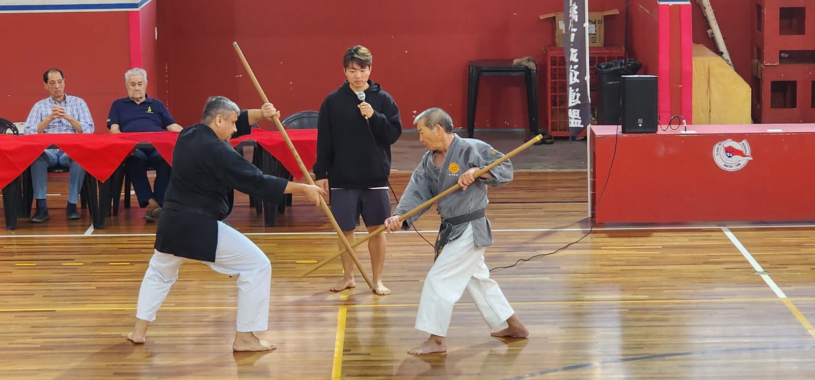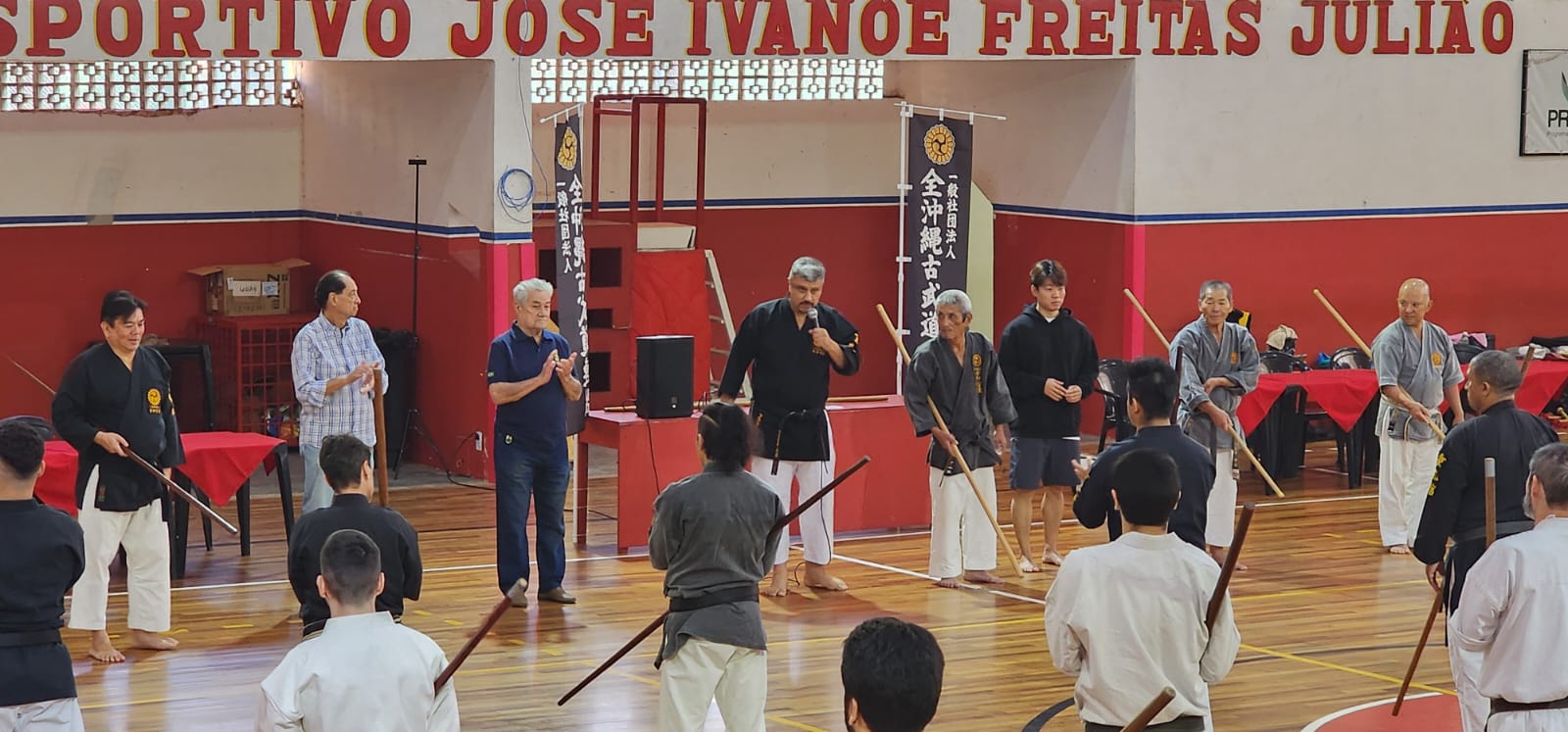 O evento inédito, realizado no dia 27 de julho, foi conduzido pelos mestres Seiki Takushi (Hanshi 10º Dan e presidente da instituição), Masamitsu Kamiya (Hanshi 9º Dan e diretor de instrução) e Kenichiro Kinjo (Kyoshi 7º Dan e secretário-geral), que vieram ao Brasil pela primeira vez para divulgar o Kobudo, arte marcial que representa o “caminho das armas antigas”, utilizando armas como bo, sai, tonfa, nunchaku, eku e kama.