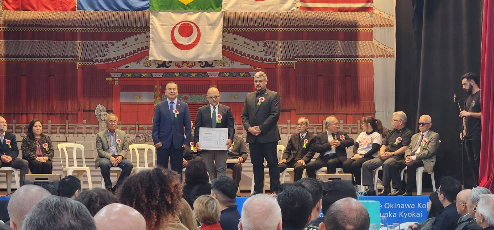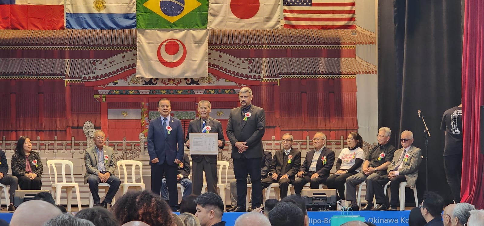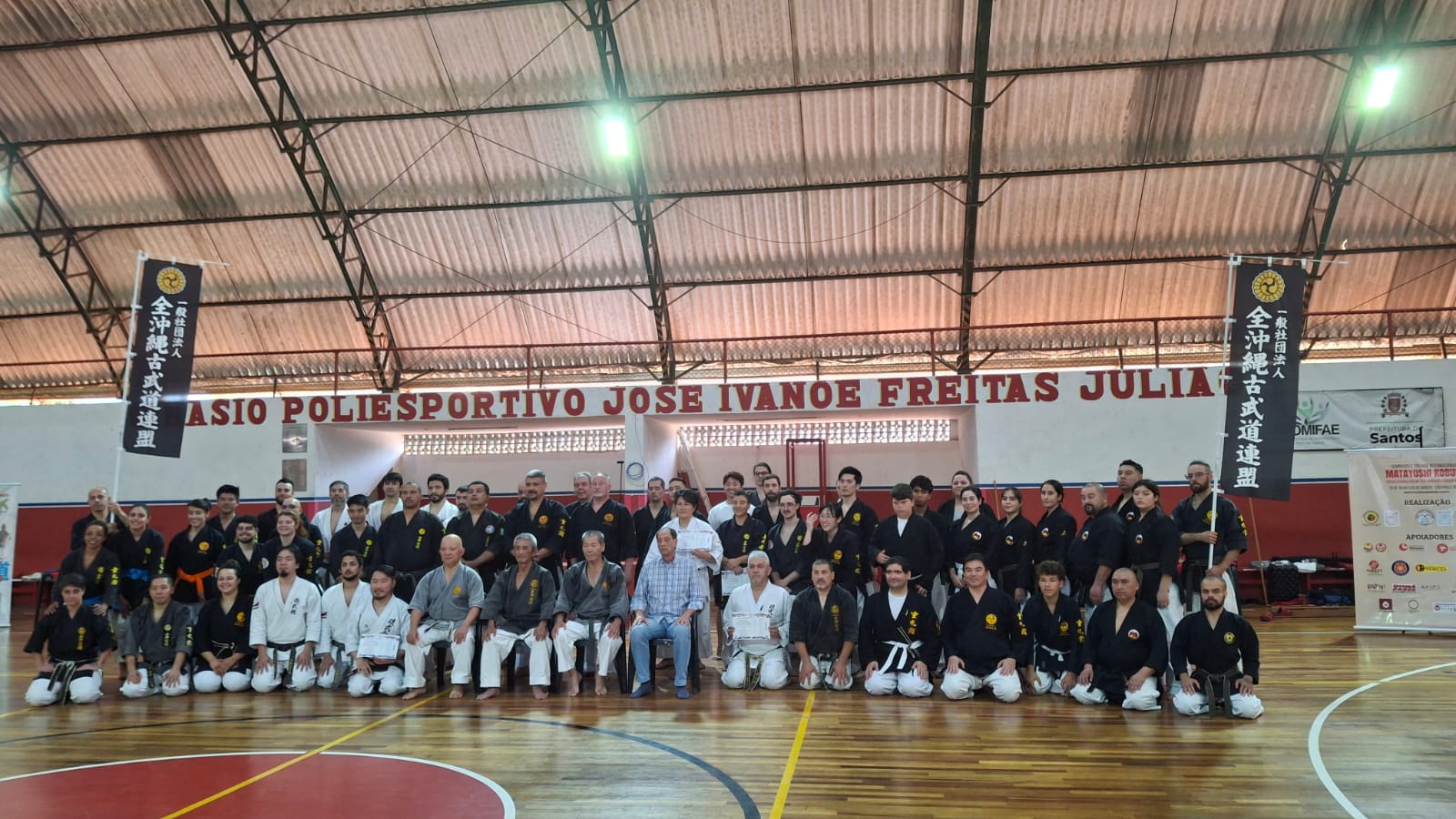 O evento inédito, realizado no dia 27 de julho, foi conduzido pelos mestres Seiki Takushi (Hanshi 10º Dan e presidente da instituição), Masamitsu Kamiya (Hanshi 9º Dan e diretor de instrução) e Kenichiro Kinjo (Kyoshi 7º Dan e secretário-geral), que vieram ao Brasil pela primeira vez para divulgar o Kobudo, arte marcial que representa o “caminho das armas antigas”, utilizando armas como bo, sai, tonfa, nunchaku, eku e kama.