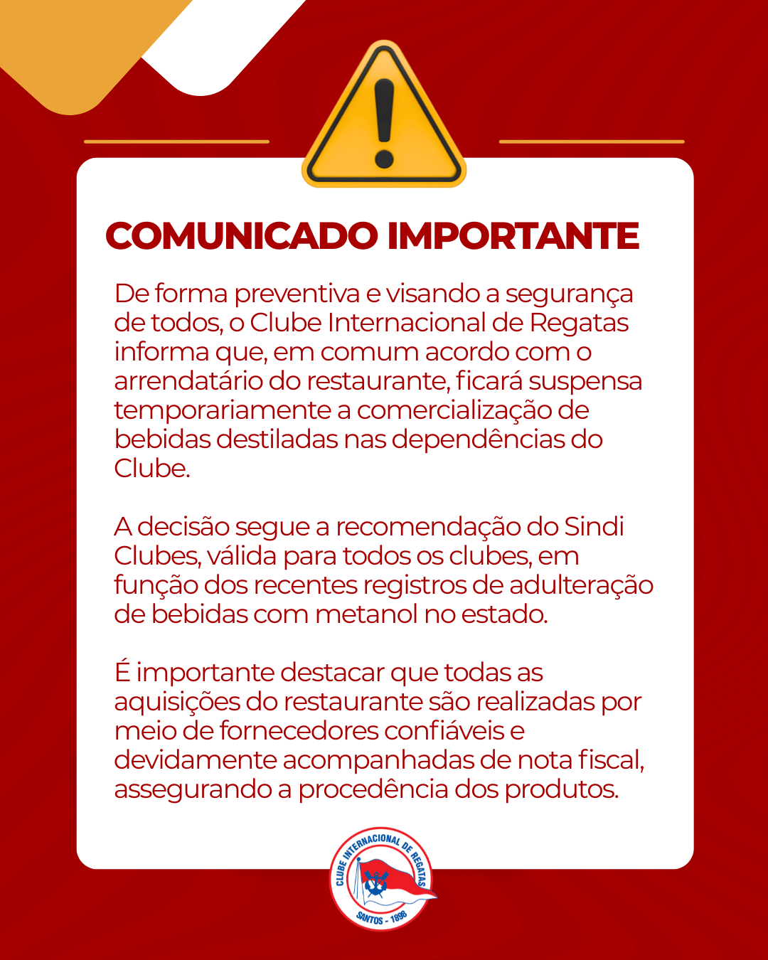 De forma preventiva e visando a segurança de todos, o Clube Internacional de Regatas informa que, em comum acordo com o arrendatário do restaurante, ficará suspensa temporariamente a comercialização de bebidas destiladas nas dependências do Clube.